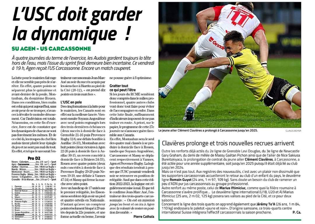 L'Indépendant : Face au SU Agen, l'US Carcassonne doit garder la dynamique !