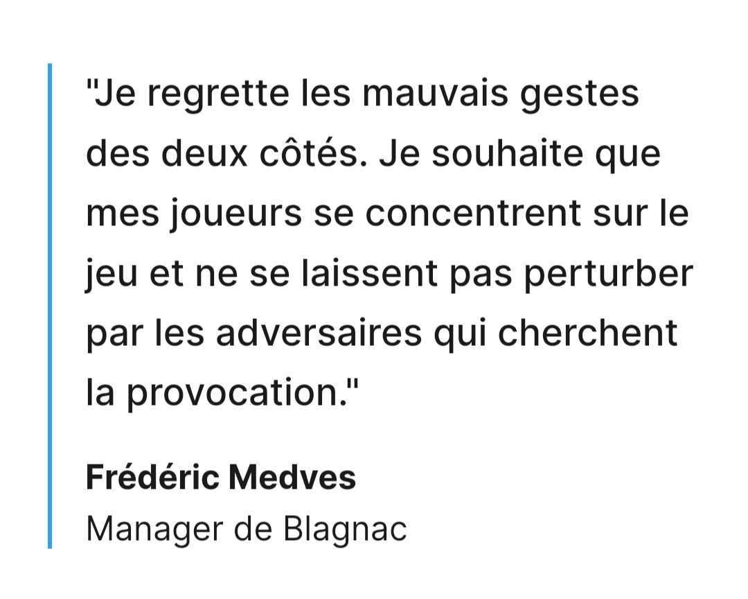 le chien aboie , la caravane passe......Les joueurs que nous rencontrons en nationale est le Graal pour eux ils iront pas plus loin et certains de leurs managers comme celui de Blagnac ont l'impression d’être les entraîneurs de l’équipe de France ......Ils ont atteint le niveau de leurs compétences. Faut pas leurs en vouloir.....Petit ils sont petit ils resteront.......Et celui de Blagnac en a terminé avec sa croissance ...
