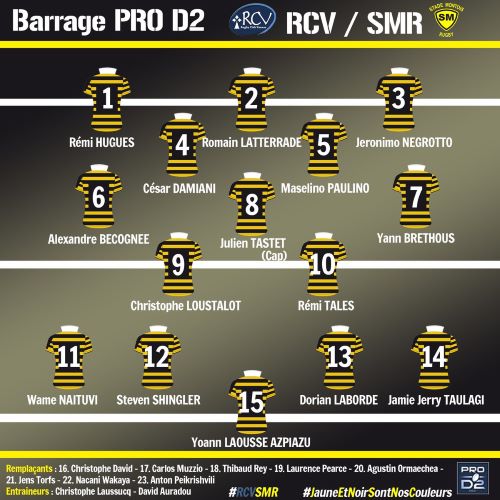 Le XV DE DEPART POUR VANNES : 15. Bouthier (cap.) ; 14. Curtis, 13. Holder, 12. Burgaud, 11. Duplenne ; 10. Hisenbeck, 9. Le Bail ; 7. Chalmers, 8. Kamikamica, 6. Abiven, 5. Tuohy, 4. Jones, 3. Tafili, 2. Leafa, 1. Séneca