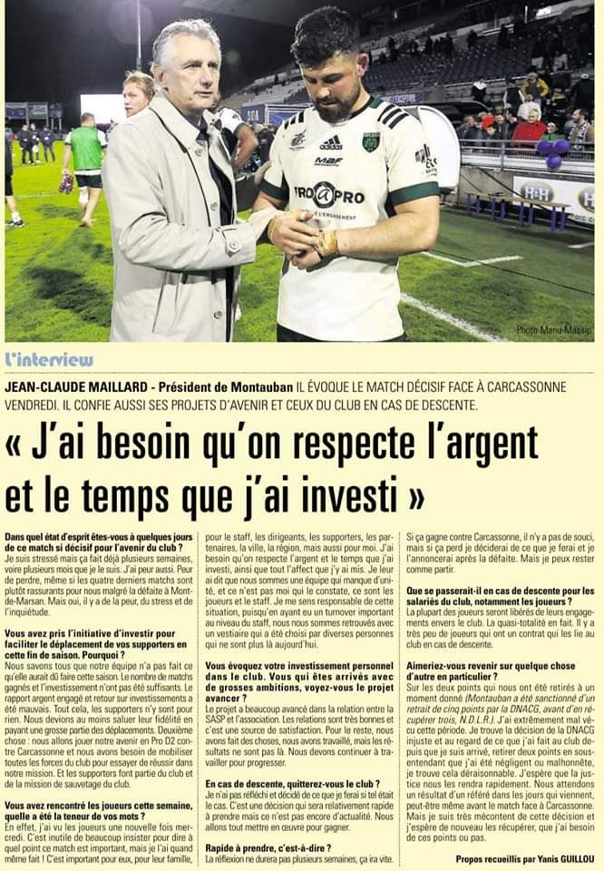 Pour en revenir au match à Montauban, nos jaunes et noirs vont tout donner j'en suis convaincu d'autant que nos 300 supporters feront du bruit et que Montauban aura tout autant la pression. Du coup, on aura un vrai match de phase finale ce qui gommera la notion de réception à domicile pour l'USM. Même si c'est pas loin, j'espère que les joueurs partiront la veille pour bien s'imprégner de l'atmosphère de Sapiac.