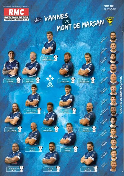 Le XV DE DEPART POUR VANNES : 15. Bouthier (cap.) ; 14. Curtis, 13. Holder, 12. Burgaud, 11. Duplenne ; 10. Hisenbeck, 9. Le Bail ; 7. Chalmers, 8. Kamikamica, 6. Abiven, 5. Tuohy, 4. Jones, 3. Tafili, 2. Leafa, 1. Séneca