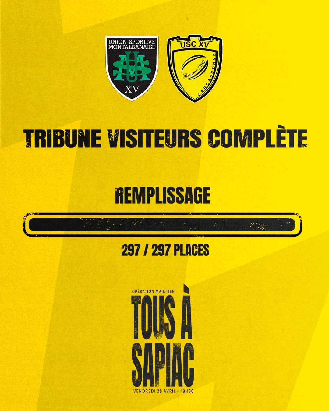 Pour celles et ceux qui souhaitent aller au stade Sapiac encourager les Jaune&Noir, le club vous invite à réserver via le formulaire ci-après. Vous pourrez y réserver votre place dans un bus au départ de Domec ou réserver simplement votre place au stade dans la zone attribuée aux supporters de l’USC. Nous vous demandons simplement de vous inscrire dès cette semaine de manière à ce que le club puisse anticiper le nombre de bus à affréter ainsi que le nombre de places à bloquer auprès de la billetterie de l’USM.