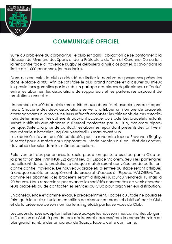 Alors pourquoi Montauban y arrive et pas nous ???Pierre a écrit : 11 mars 2020, 17:37 Moi je suis d accord avec les présidents, tout le monde ou personne !!!!