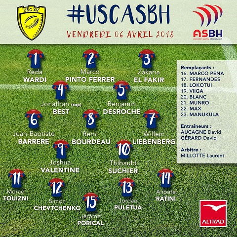 Très belle compo! Certain regrette un soit disant manque de puissance sur le banc mais tu vas rentrer Tison qui avance sur chaque ballon et Castant/Devisme/Burduli/Doumenc qui vont amener un gaz terrible (rappelez vous les 2nde mi temps à Bayonne et à Grenoble)! Ne pas confondre gros tonnage et puissance car sans vitesse tu franchis plus de nos jours! Pour moi demain on gagne!