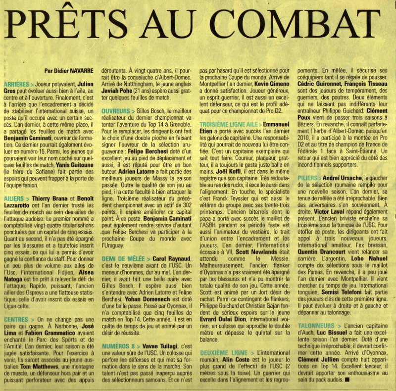 Toujours pas de Newlands ??? qui peut me dire qui est Guillemot ???Mistabone a écrit :US CARCASSONNE, match amical : la compo face à Aurillac