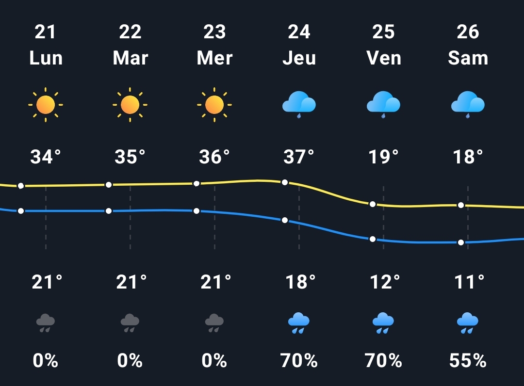 Il va falloir être intelligent cette semaine sur la programmation des entraînements vu la chaleur annoncée (40 jusqu'à jeudi). Peut être décaler le matin très tôt ou le soir très tard... car les organismes vont chargés. Attention aux blessures !!!!