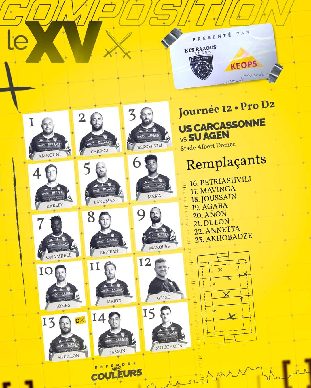 Jeudi 24 novembre à 21h, l’US Carcassonne reçoit Agen dans le cadre de la 12ème journée de Pro D2. Malheureusement certains joueurs sont indisponibles pour affronter les Agenais.