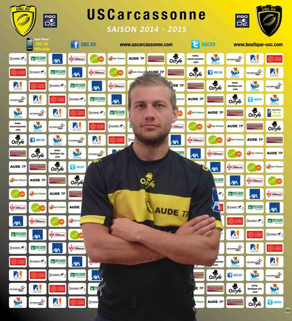 14-15 : Carcassonne en Pro D2, 26 matches dont 20 en tant que titulaire (5 essais, 6 pénalités, 1 drop, 6 transformations, 1 carton jaune)