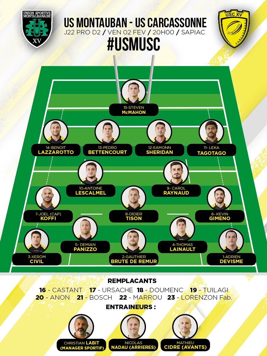 Daniel a écrit : 01 févr. 2018, 17:59LA COMPO CONTRE MONTAUBANPremière ligne : Devisme – Bruté de Rémur – Civilhttp://www.uscarcassonne.com/la-compo-c ... ntauban-2/